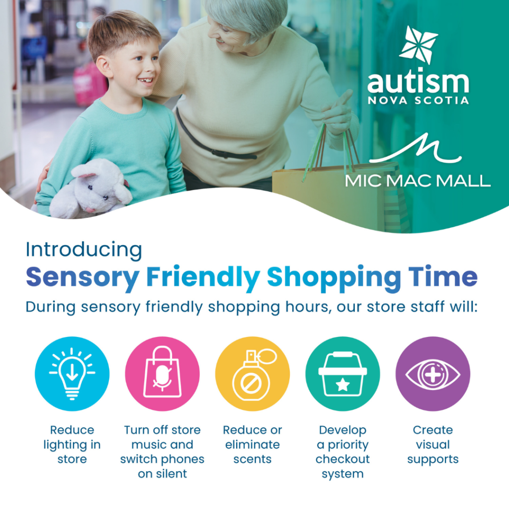 Mic Mac Mall – Sensory Shopping: Mic Mac Mall is proud to offer Sensory Friendly Shopping in partnership with Autism Nova Scotia on the last Monday evening of every month from 6pm-9pm.